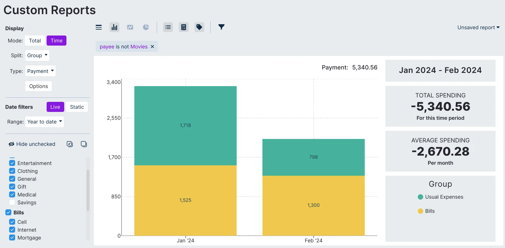Custom Reports are really powerful and can provide unique insights. We now highlight a complex example that uses most features. Our goal is to have a stacked bar chart broken down by group with month on X axis, in a certain time frame, excluding a certain category and payee.